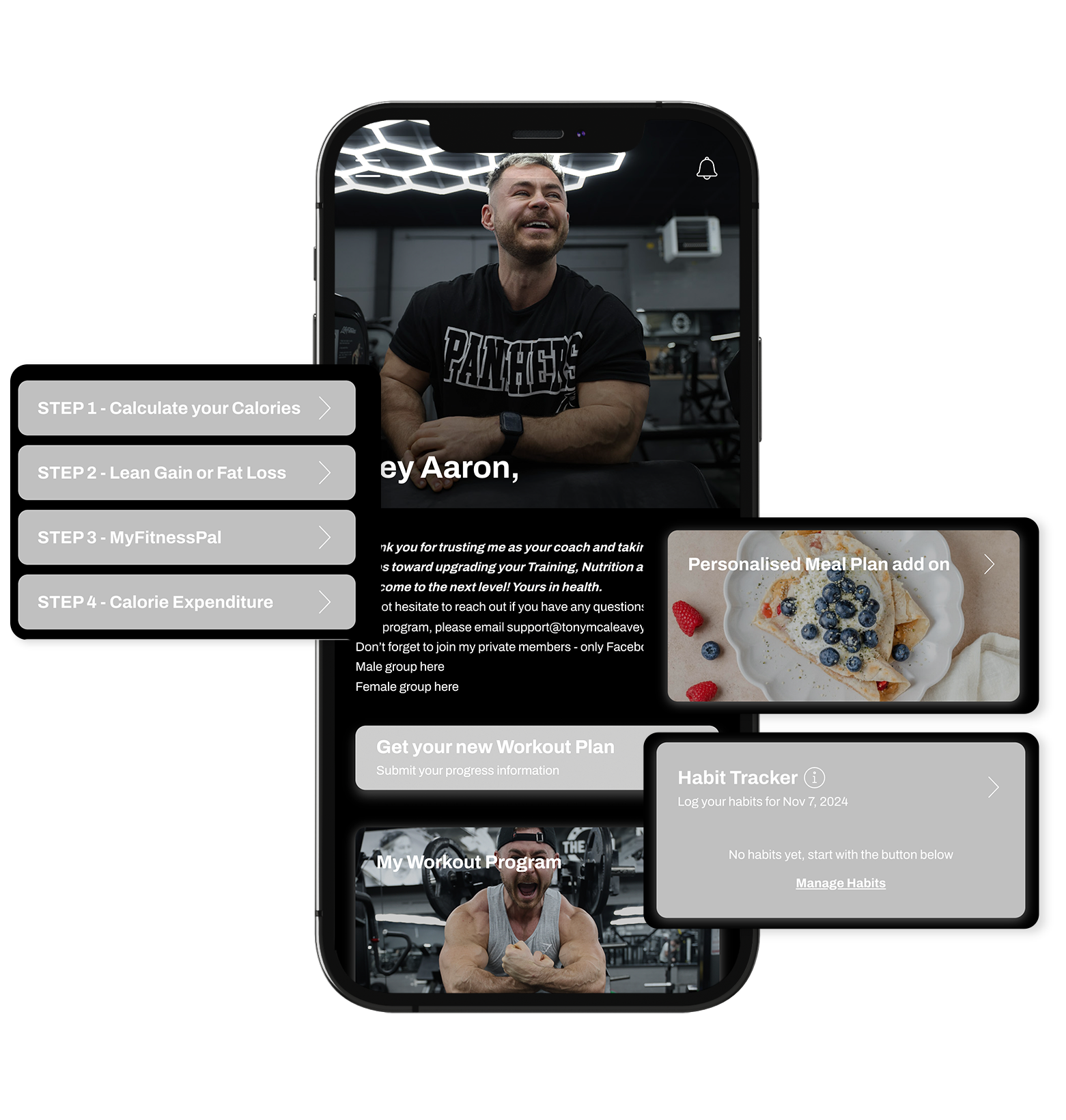 I'll make following your plan and tracking your progress simple and easy, you'll find your unique and personalised meal and training plan on my members-only app. Everything you need will be available on your phone.